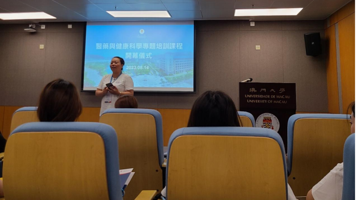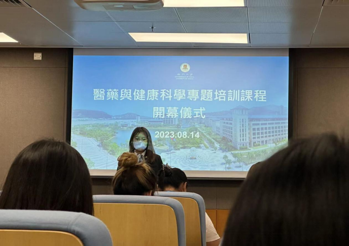 澳门大学持续进修中心主任刘丁己教授热情地向伟德官方网站的研学团队介绍关于此次研学活动的团队与行程,分别是黄冠豪教授的“基因生物信息学基础与前沿介绍”、路嘉宏教授(系伟德官方网站员工)的“癌症及神经退行性疾病中的自噬溶酶体途径”、黄植富教授的“生物医学科技:生命科学与健康的奥秘”以及吴蔼琳教授的“中医药在大健康产业中的应用与发展”。随后研学活动队长喻翠云经理在开幕仪式上表达了对澳门大学的精心安排的感谢以及对参与研学活动的南华学子的期望。