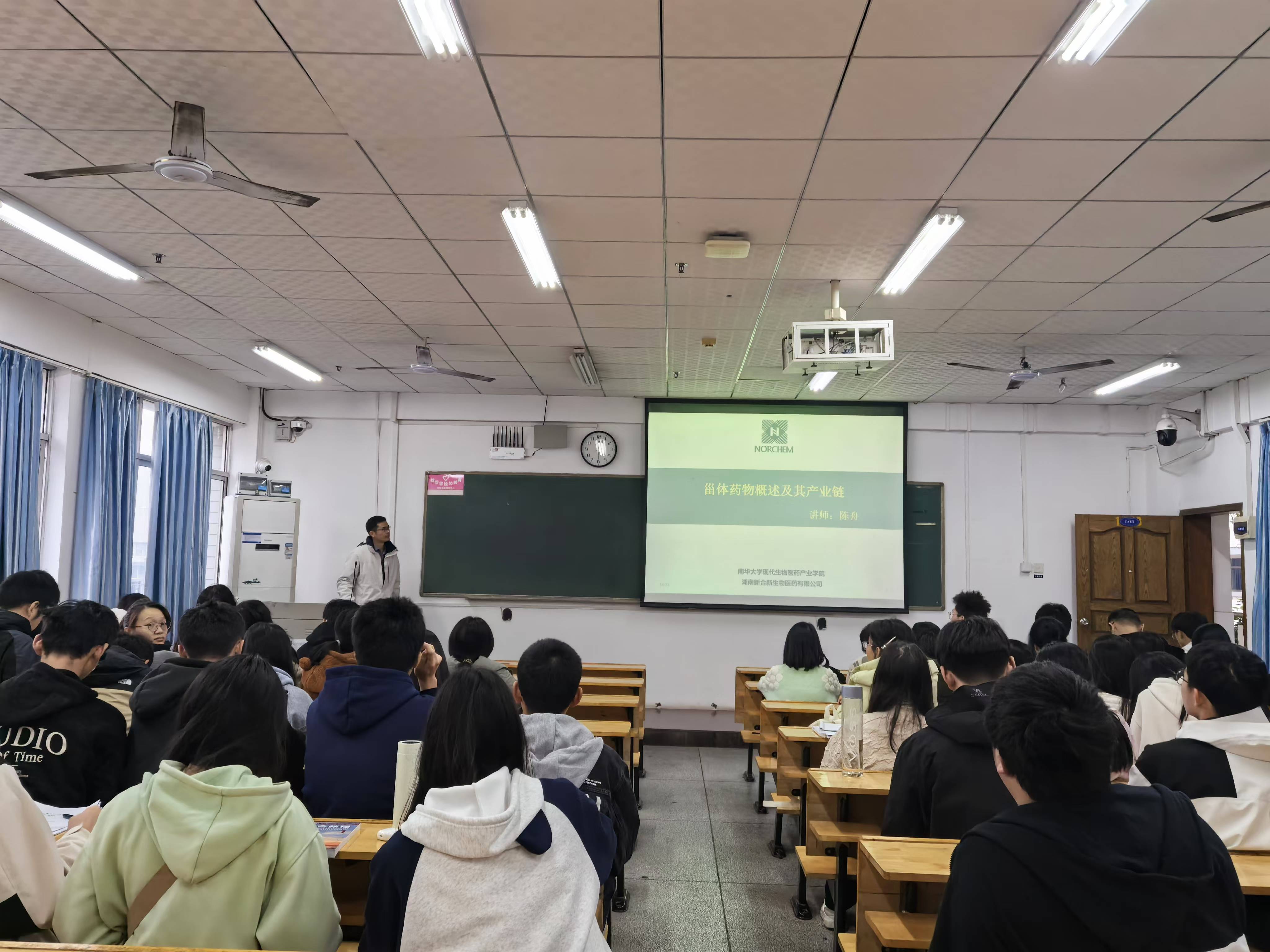 课堂上,陈舟详细介绍了湖南新合新生物医药有限公司的情况,介绍了他们企业的龙头产业——甾体药物概述及其产业链,同时结合企业需求,引导药学专业员工进行职业规划,并结合自身经历分析了当前行业就业形势,通过互动式的教学引发同学们的思考。他呼吁同学们要认真学好专业知识,丰富自己的实践经验,要做一名敢于尝试、不怕失败、勇于拼搏的老员工。