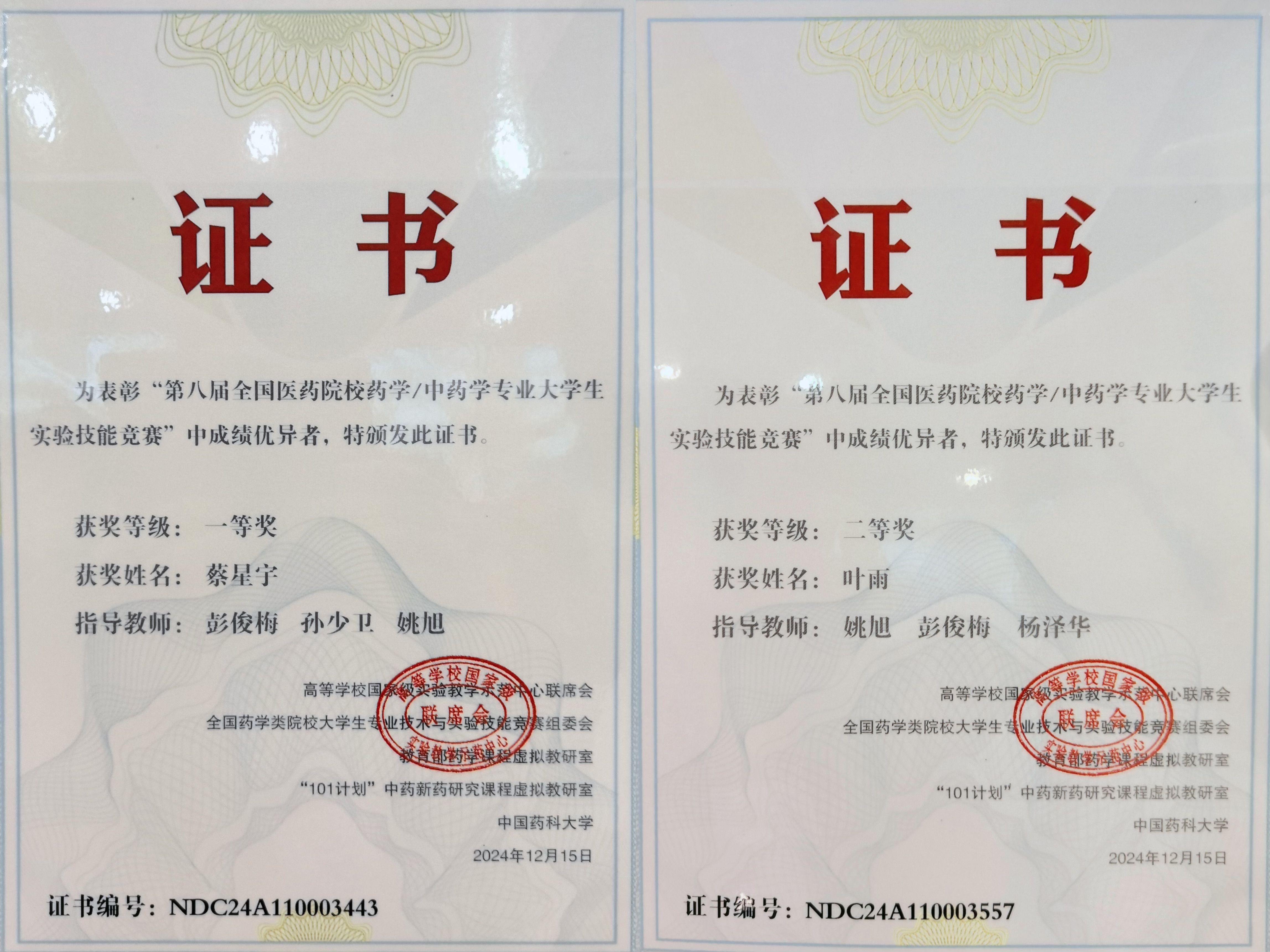 2024年12月15日,“第八届全国医药院校药学/中药学专业老员工实验技能竞赛”决赛在成都中医药大学落下帷幕。经过激烈的角逐,2021级药学专业的蔡星宇和叶雨同学发挥出色,分别获得一等奖和二等奖,创下历年来最佳赛绩。