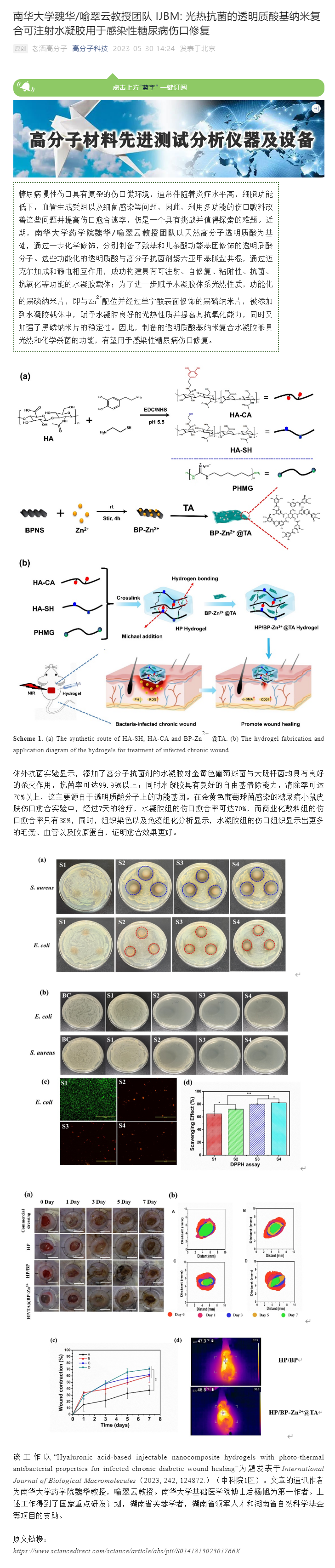 糖尿病慢性伤口具有复杂的伤口微环境,通常伴随着炎症水平高,细胞功能低下,血管生成受阻以及细菌感染等问题,因此,利用多功能的伤口敷料改善这些问题并提高伤口愈合速率,仍是一个具有挑战并值得探索的难题。近期,bevictor伟德魏华/喻翠云教授团队以天然高分子透明质酸为基础,通过一步化学修饰,分别制备了巯基和儿茶酚功能基团修饰的透明质酸分子。这些功能化的透明质酸与高分子抗菌剂聚六亚甲基胍盐共混,通过迈克尔加成和静电相互作用,成功构建具有可注射、自修复、粘附性、抗菌、抗氧化等功能的水凝胶载体;为了进一步赋予水凝胶体系光热性质,功能化的黑磷纳米片,即与Zn2+配位并经过单宁酸表面修饰的黑磷纳米片,被添加到水凝胶载体中,赋予水凝胶良好的光热性质并提高其抗氧化能力,同时又加强了黑磷纳米片的稳定性。因此,制备的透明质酸基纳米复合水凝胶兼具光热和化学杀菌的功能,有望用于感染性糖尿病伤口修复。