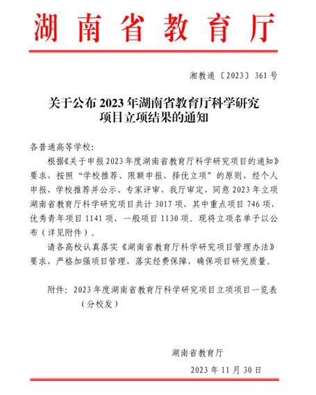 11月30日,湖南省教育厅2023年项目资助评审结果公布,bevictor伟德苏波、彭雪、孙少卫、王姝之4位教师获得2023年湖南省教育厅重点项目立项资助,王卫国、江伟凡、张宇、刘映、彭颖、刘阳6位教师获得2023年湖南省优秀青年项目立项资助。