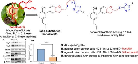 题为“Semisynthesis and biological evaluation of novel honokiol thioethers against colon cancer cells HCT116 via inhibiting the transcription and expression of YAP protein”的研究论文。在该研究中,杨瑞阁和郭勇教授课题组联合郑州大学张赛扬教授通过对中药厚朴中的活性物质和厚朴酚进行结构优化,制备了一系列带有1,3,4-噁二唑部分的新型和厚朴酚硫醚,并评价了它们对三种消化系统肿瘤细胞的抗癌活性。生物学评价显示和厚朴酚衍生物3k对HCT116细胞表现出最佳的抗增殖活性,IC50值为6.1μmol/L,优于阳性药物5-氟尿嘧啶(IC50:9.63±0.27mol/L)。构效关系(SARs)表明,–(4-NO2)Ph、3-吡啶基、–(2-F)Ph、–(4-F)Ph、–(3-F)Ph、–(4-Cl)Ph和–(3-Cl)Ph基团的引入有利于增强标题和厚朴酚硫醚的抗癌活性。进一步研究发现和厚朴酚硫醚3k能很好地抑制结肠癌细胞HCT116的增殖,使细胞停滞在G1期并诱导细胞死亡。此外,初步的机制研究表明,3k直接抑制YAP蛋白的转录和表达,而不激活Hippo信号通路。因此,和厚朴酚硫醚3k可被深入开发用于