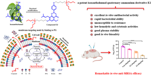 题为“Novel membrane-targeting isoxanthohumol-amine conjugates for combating methicillin-resistantStaphylococcus aureus(MRSA) infections”的研究论文。在该研究中,杨瑞阁和郭勇教授课题组通过模拟抗菌肽(AMPs)的结构和膜靶向特性,成功制备了一系列异黄腐醇-胺共轭物作为抗菌剂。经过生物活性评估,得到了化合物E2,该化合物对金黄色葡萄球菌和临床MICs = 0.25-1μg/mL),优于万古霉素,而且具有低溶血和良好的膜选择性。此外,E2还具有快速杀灭细菌、不易产生耐药性、相对较低的细胞毒性和良好的膜选择性等特点。细胞毒性低,血浆稳定性好。机理研究表明,E2能通过与磷酸酶的特异性结合来破坏细菌膜。通过与细菌膜上的磷脂酰甘油特异性结合来破坏细菌膜,从而导致细胞内ROS升高和渗漏。细胞内ROS升高,DNA和蛋白质泄漏,最终杀死细菌。值得注意的是,E2与相同剂量的万古霉素相比,E2具有良好的体内安全性和更好的体内疗效,因此有可能成为是一种潜在的抗菌剂,可用于治疗MRSA感染。这些发现将为进一步开发利用天然异黄腐醇对抗耐药细菌提供重要启示。