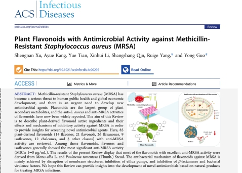 题为“Plant Flavonoids with Antimicrobial Activity against Methicillin-ResistantStaphylococcus aureus(MRSA)” 的综述性论文,入选为封面论文。在该研究中,杨瑞阁和郭勇教授课题组综述了85种具有抗耐甲氧西林金黄色葡萄球菌活性的植物黄酮类化合物(14种黄酮、21种黄酮醇、26种黄烷酮、9种异黄酮、12种查尔酮和3种其他类型)。在这些黄酮类化合物中,黄酮和异黄酮通常表现出最显著的抗MRSA活性(MIC:1–8μg/mL)。大多数具有优异活性的黄酮类化合物对MRSA的抗菌机制主要是通过破坏膜结构、抑制外排泵以及抑制β-内酰胺酶和细菌毒力因子来实现的。这篇综述为开发基于天然产物黄酮类化合物的新型抗菌药物治疗MRSA感染提供见解。