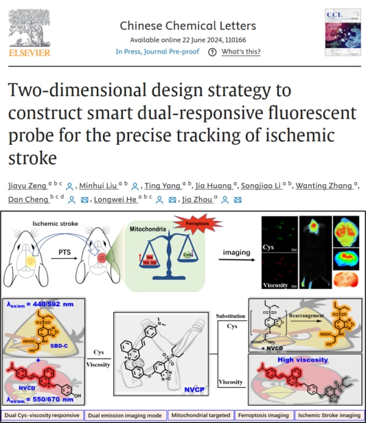 荧光成像技术由于其高灵敏度、高选择性、高时空分辨率、操作简单、低成本等优势,它作为一种新兴的检测手段在基础研究和临床诊断领域越来越受到重视。开发高性能的光学诊断试剂是实现高保真、精准检测的其中关键一环。近日,bevictor伟德荧光探针与生物医学成像实验室何隆薇教授团队在光学诊断试剂设计及应用取得新进展,相关研究成果以“Two-dimensional design strategy to construct smart dual-responsive fluorescent probe for the precise tracking of ischemic stroke”为题在权威期刊《Chinese Chemical Letters》(中科院1区TOP期刊,影响因子9.4)发表研究性论文。