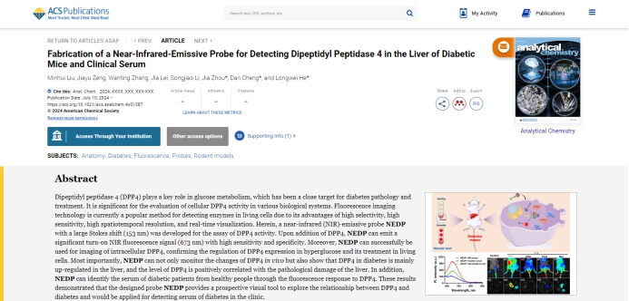 近日,bevictor伟德荧光探针与生物医学成像实验室何隆薇教授团队在糖尿病光学诊断试剂设计及应用取得新进展,相关研究成果以“Fabrication of aNear-infrared-emissiveProbe forDetectingDipeptidylPeptidase 4 in theLiver ofDiabeticMice andClinicalSerum”为题在权威期刊《Analytical Chemistry》(中科院1区TOP期刊,影响因子6.7)发表研究性论文。