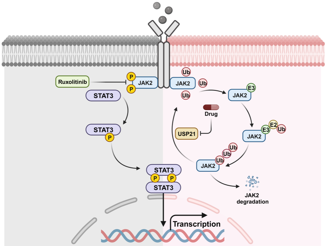 据报道,JAK2/STAT3信号通路作为抗癌药物开发的经典药靶,在三阴性乳腺癌中过度激活且促进癌细胞的增殖和转移,去泛素化酶USP21介导了JAK2相关的泛素元件的活性,且USP21在TNBC中高表达并促进TNBC紫杉醇耐药。由此,我们提出通过小分子化合物靶向USP21/JAK2/STAT3轴的新机制作为治疗TNBC的新策略(图1)。