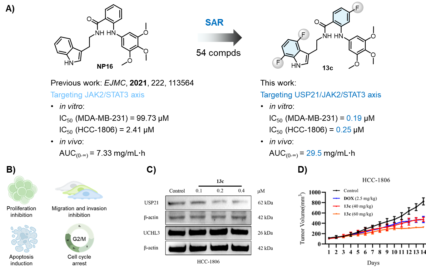 课题组前期研究工作中发现了NP16(图2A),其对JAK2/STAT3信号传导具有显著的调控效果,对TNBC细胞系HCC-1806的增殖表现出一定的抑制潜力,为我们开发靶向USP21/JAK2/STAT3轴的抗TNBC先导药物提供了良好的起始化合物。基于此,我们设计并合成了54个新颖的邻氨基苯甲酰胺类衍生物,并通过SAR研究确定了活性最优的氟代衍生物13c。相较于化合物NP16,化合物13c对TNBC细胞的抗增殖活性分别提升了523和10倍。作用机制研究表明,13c通过抑制USP21蛋白表达,减弱JAK2的去泛素化过程,使其被泛素蛋白酶系统识别和降解,从而进一步通过JAK2/STAT3轴促进TNBC细胞凋亡相关的死亡。体内研究表明,13c表现出合理的药代动力学特性,并在HCC-1806异种移植模型中产生显著的肿瘤生长抑制(TGI = 67.65%),安全耐受性可接受。此外,13c与PTX联合使用对紫杉醇耐药的TNBC表现出显著的协同作用。总体而言,13c可以作为USP21/JAK2/STAT3靶向的抗TNBC先导分子,具有进一步研究的价值。(doi.org/10.1016/j.ejmech.2024.116500)