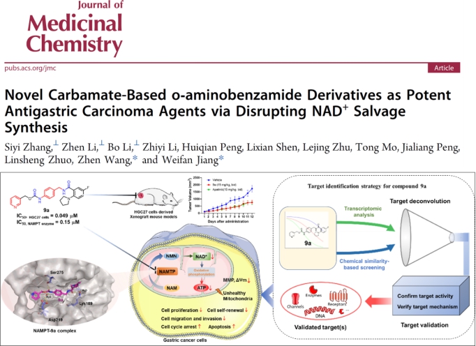 基于此基础,本研究以F8骨架结构为先导,通过对其进一步修饰改造及抗胃癌细胞活性筛选得到了化合物9a。相比前体化合物F8,9a具有更强的抗未分化胃癌细胞活性(HGC-27 cells, IC50= 0.049 μM)。其抗胃癌作用涉及克隆形成、细胞增殖、转移、细胞周期和代谢等多个细胞过程。转录组分析与基于配体的靶点预测方法表明,9a是一种潜在的NAMPT抑制剂(IC₅₀ = 0.15 μM),能够通过降低细胞内NAD⁺和ATP水平,从而发挥抗胃癌作用。该研究表明9a是一种具有显著抗未分化型胃癌作用的潜在NAMPT抑制剂,为通过靶向NAD⁺生物合成开发新型抗胃癌药物奠定了基础。研究结果发表于药物化学经典权威期刊《Journalof Medicinal Chemistry》(中科院1区Top,DOl: 10.1021/acs.jmedchem.4c02686)。本论文通讯作者为bevictor伟德王震教授和江伟凡博士,第一作者为bevictor伟德硕士研究生张思怡、李真及李博。