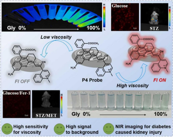 糖尿病肾损伤已成为导致肾脏疾病的重要原因之一。早期发现和干预可以有效延缓肾脏疾病的发展。粘度作为细胞微环境的关键参数,在维持线粒体功能和细胞稳态中起着关键作用,其失调与糖尿病肾损伤的发病机制密切相关。然而,很少有报道使用荧光探针来确定糖尿病肾损伤过程中的线粒体粘度变化。在此,该团队使用“渐进优化”策略开发了一种基于半花菁的近红外荧光探针P4,能够对肾细胞和体内线粒体粘度变化进行靶向成像。P4探针对粘度具有高灵敏度和选择性,在具有高线性关系的高粘度环境中表现出约146倍的信号增强。P4的荧光量子产率从PBS(低粘度)中的< 0.001增加到90%甘油(高粘度)中的0.12。此外,P4探针显示出优异的线粒体定位效率,能够在糖尿病肾损伤进展和治疗干预期间实时监测线粒体粘度变化。P4探针在糖尿病肾损伤小鼠模型中检测到肾脏粘度变化,与健康组照相比,信号强度增加了1.5倍。使用P4探针,首次在高葡萄糖诱导的肾细胞损伤模型中观察到粘度变化与铁死亡相关。这项工作将为更深入地了解肾脏疾病的粘度变化提供有意义的工具,并有望促进肾脏疾病的早期诊断和治疗。相关研究成果以“Fabricating a mitochondrial viscosity-activated fluorescent probe for highly sensitive imaging of kidney injury in vivo”为题发表在国际权威期刊《Sensors and Actuators B: Chemical》(中科院一区TOP期刊,影响因子8.0);本项工作由团队硕士生郑显贵和助理研究员张红帅博士为共同第一作者完成,伟德官方网站附属南华医院程丹研究员和bevictor伟德何隆薇教授为本文通讯作者。