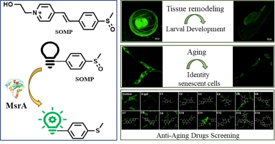 细胞增殖与衰老是密切相关的生物学过程,在组织重塑、应激反应及衰老相关疾病中扮演着双重角色。然而,细胞衰老的动态复杂性使得传统检测方法难以实现活细胞内生物标志物的原位精准监测,导致关键生物学信息丢失。研究表明,MsrA活性降低会缩短秀丽隐杆线虫、果蝇、小鼠等多种模式生物的寿命,而提高其表达水平则可延缓衰老并促进健康寿命。因此,MsrA被视为调控细胞衰老的关键分子靶点。为此,研究团队设计了由苯乙烯基吡啶鎓染料和亚砜基团构成的特异性MsrA荧光探针SOMP。该探针具有超高灵敏度(检测限达8.9 ng/mL)、优异的选择性(受MsrB2/B3干扰极小)和低细胞毒性的优势,适用于细胞长期观测。基于SOMP的卓越性能,该研究实现了多项创新应用:1)原位监测细胞增殖与幼体发育:首次在活细胞及模式生物中动态可视化MsrA活性变化。2)精准评估衰老进程:在多种衰老模型中成功追踪MsrA的活性变化,为衰老机制研究提供新方法。3)高通量抗衰老药物筛选:利用SOMP首次发现姜黄素的抗衰老作用可能与MsrA介导的氧化还原信号相关,为天然抗衰老药物开发提供新线索。该研究开发的SOMP探针突破了传统检测技术的局限,为细胞衰老的原位分析、衰老相关疾病机制探索及抗衰老药物开发提供了高效、可靠的新工具,有望为精准医学与衰老相关领域提供无创原位可视化新方法。该成果以“A Novel Visual Perspective for Tracking of Larval Development, Aging and Anti-Aging Drugs Screening by Fluorescent Sensing MsrA”为题发表于国际权威期刊《Analytical Chemistry》(中科院一区TOP期刊,影响因子6.8);该研究由团队博士研究生曾佳玉、bevictor伟德硕士研究生杨婷作为共同第一作者完成,伟德官方网站附属第一医院周佳主任、附属南华医院程丹研究员和bevictor伟德何隆薇教授为通讯作者。