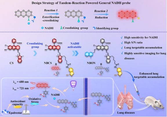 糖尿病作为一种全球高发的临床代谢性疾病,其长期高血糖状态可引发多器官并发症,但肺部作为糖尿病靶器官的病理机制(如NADH/NAD⁺失衡诱导氧化应激)长期缺乏实时监测工具。传统NADH探针因灵敏度低(检测限μM级)、组织穿透性差(可见光成像)及非特异性干扰等问题,难以实现活体深部组织(如肺部)的精准检测。为此,本研究提出一种基于串联反应策略的近红外(NIR)荧光试剂NBON,通过结合苯硼酸靶向基团(邻近二醇酯化交联)与半菁染料荧光基团(NIR发射波长721 nm),实现了NADH的高灵敏度检测(检测限45 nM)及肺部特异性富集。在细胞层面,NBON成功揭示了高糖环境下NADH的动态波动及依帕司他(EPS)通过抑制醛糖还原酶恢复氧化还原平衡的机制;在动物模型中,该探针实时成像链脲佐菌素(STZ)诱导的糖尿病小鼠肺部NADH异常累积,并评估了二甲双胍/EPS的治疗效果;此外,NBON还可区分肺转移瘤与原位肿瘤组织,辅助术中精准切除。这一研究不仅填补了NADH活体动态监测的技术空白,首次在分子层面阐明EPS缓解糖尿病肺病的抗氧化机制,更为糖尿病并发症诊疗、药物开发及肿瘤精准手术提供了通用化工具,推动了代谢性疾病研究与临床转化的深度融合。该成果以“Tandem reaction-powered near-infrared fluorescent molecular reporter for real-time imaging of lung diseases”为题发表在国际权威期刊《Chemical Science》(中科院1区TOP期刊,影响因子7.6);bevictor伟德和附属南华医院为本论文通讯单位,团队成员硕士生胡琰、助理研究员张红帅博士和硕士生丁一腾为论文的共同第一作者,伟德官方网站附属南华医院程丹研究员和bevictor伟德何隆薇教授为论文的共同通讯作者。