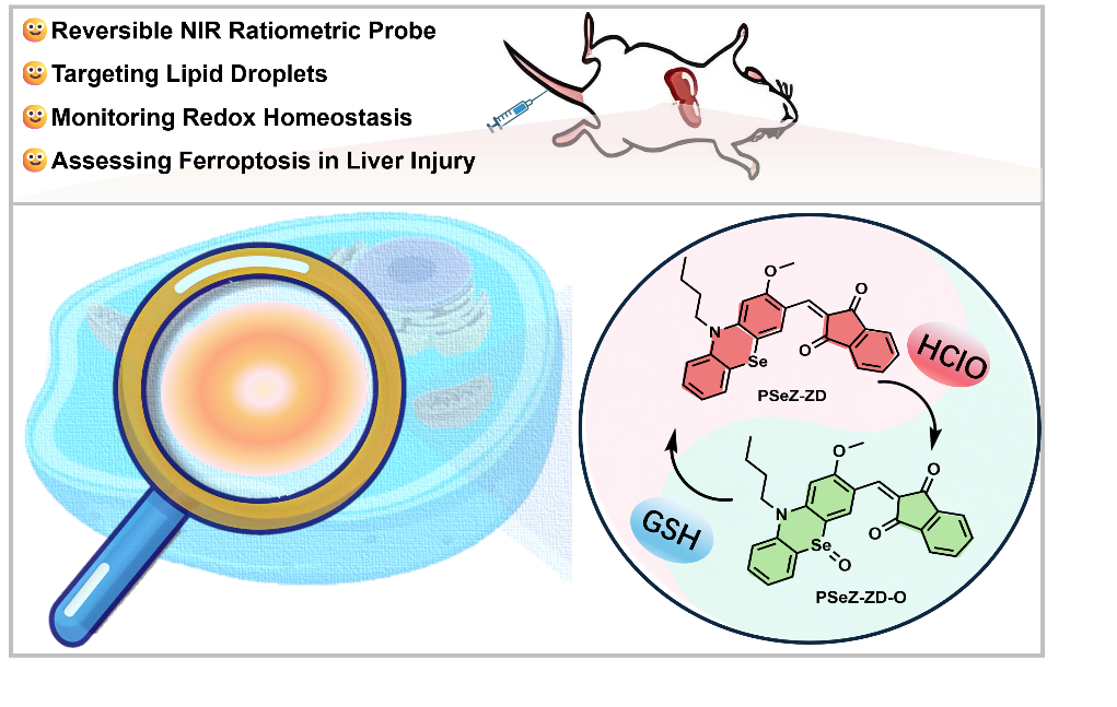 药物性肝损伤(DILI)的准确诊断和及时治疗对于防止其进一步发展为其他肝脏疾病甚至肝衰竭至关重要。研究发现,细胞内的氧化还原平衡可能与DILI的发生密切相关,次氯酸(HClO)和谷胱甘肽(GSH)作为关键的氧化还原对,能够反映细胞内的氧化还原状态。与此同时,铁死亡已成为多种病理条件下的关键机制,其在肝损伤中的作用也引起了越来越多的关注。最近,科研人员发现,脂质滴(LDs)在DILI发生中起着重要作用,脂质滴作为脂质代谢和储存的主要细胞器,其功能的紊乱与铁死亡和脂肪肝密切相关。由于脂质滴的体积小且动态性强,开发能够成像脂质滴的荧光探针成为了观察其动态变化以及研究相关疾病的关键。然而,迄今为止,尚无可逆探针能够有效监测HClO和GSH的氧化还原平衡,尤其是在脂质滴内。