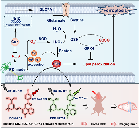 帕金森病(Parkinson's disease, PD)是一种常见的神经退行性疾病,其发病机制复杂。近年来,铁死亡作为一种由铁调控、脂质过氧化驱动的细胞死亡方式,被认为与PD的发生发展密切相关。羟基自由基(•OH)的过量积累会引起严重神经损伤,并与多种神经退行性疾病相关,但其在PD中的作用尚未得到明确阐释。受限于缺乏有效的检测工具,目前尚无能够在铁死亡及PD过程中实时监测•OH动态变化的荧光探针。在此背景下,bevictor伟德医用荧光材料团队设计并合成了一系列•OH响应型比率近红外(NIR)荧光探针(DCM-PD1~8),用于监测铁死亡介导的PD中•OH水平。研究发现,其中DCM-PD2表现出最佳的光物理性质,具备高灵敏度(检测限约22.9 nM)、优异选择性、30分钟以内的快速响应速度及良好的深层组织穿透能力。凭借出色的膜通透性和低毒性,DCM-PD2可同时用于追踪内源性和外源性•OH变化。更为重要的是,该探针能够顺利穿越血脑屏障(BBB),首次实现对PD模型小鼠脑部•OH活性的实时成像,结果显示PD小鼠脑区•OH水平显著升高。此外,利用DCM-PD2成功揭示了姜黄素(Cur)在PD模型中的神经保护作用,其主要通过Nrf2/SLC7A11信号通路调控铁死亡过程,从而减轻神经损伤。该研究不仅为理解•OH在PD中的作用机制提供了新的证据,也表明DCM-PD2是一种可靠且高效的工具,有望应用于铁死亡介导的PD的精准诊断与治疗。研究成果为探索新型PD诊断成像手段和干预策略提供了重要理论依据和实验基础。