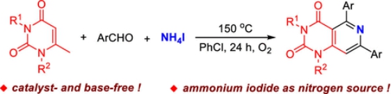 针对这一难点,bevictor伟德陈劲进博士/王震教授团队开发了一种以廉价易得的6-甲基尿嘧啶衍生物、醛和碘化铵为原料,高效构建吡啶并尿嘧啶类化合物的新方法。该方法以碘化铵作为环境友好的氮源,无需添加催化剂和碱,具有产率优异、原子经济性高和官能团兼容性好等优点,为具有重要生物活性的吡啶并尿嘧啶类化合物提供了简单高效的新途径。相关成果发表于《Organic Letters》(IF=5,中科院一区),论文第一作者为bevictor伟德硕士李姣玲,通讯作者为bevictor伟德刘新平博士、陈劲进博士和王震教授。