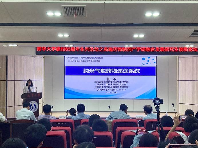 2023年10月15日,伟德官方网站建校65周年系列活动之高端药物制剂产学研融合发展研究生创新论坛成功举行。东南老员工物科学与医学工程公司杨芳教授应邀出席本次论坛,并作题为“纳米气泡药物递送系统”学术讲座。