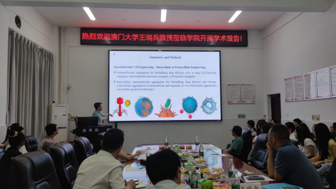 王瑞兵教授以四张简易有趣的图片开场,从三个层面展开,分别是分子层面的超分子主客体结合、纳米层面的“乐高式”组装、细胞层面的超分子组装(纳米药物通过超分子主客体组装与细胞“牵手”或者细胞内部“牵手”)。在众多有效的给药途径中,给药障碍一直是一个挑战,而细胞有着免疫逃逸和特异性蓄积,可以作为理想的药物载体进一步研究。王瑞兵教授着重讲述了超分子细胞工程的两个方面,搭便车给药的超分子偶联和搭便车给药和治疗的超分子给药聚集,通过超分子方式与纳米药物“牵手”,可以稳定细胞搭载的药物。比如,在巨噬细胞表面的纳米药物逆转了炎症的进展,超分子细胞递送化疗药物与anti-PDL1联合用药极大的增效了小鼠黑色素瘤的免疫治疗效果。