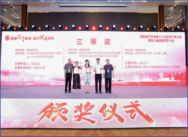 陈临溪教授凭借其在心血管分子靶标药理学研究中的突破性研究成果,荣获本届大会“药学科学技术奖——三等奖”。该成果原创性发现Apelin/APJ系统是防治动脉粥样硬化(AS)及其靶器官损伤心肌肥厚药物新靶标,为新药研发提供全新靶点,具有显著临床转化潜力。