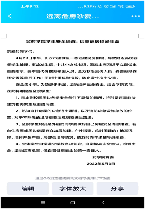 5月3日,公司党委通过各年级班群下发“致公司员工远离危房珍爱生命安全提醒”,教育引导同学们要坚决远离危房,禁止到校园周边各类安全条件不具备的场所特别是违章非法建筑物内聚集玩耍或消费,要自觉遵守公司各项规定,自觉提高安全意识,珍爱生命,坚决远离危害。