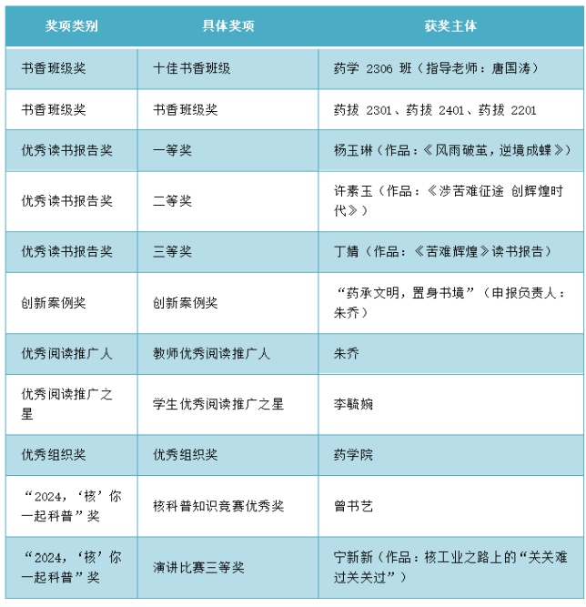 此外,药学2306班荣获“十佳书香班级”称号(指导老师:唐国涛),药拔2301、药拔2401、药拔2201获评“书香班级奖”。评选中,杨玉琳同学的《风雨破茧,逆境成蝶》获评优秀读书报告一等奖、许素玉同学的《涉苦难征途创辉煌时代》、丁婧同学的《苦难辉煌》分别获得优秀读书报告二等奖和三等奖。bevictor伟德朱乔老师荣获“优秀阅读推广人”称号,李毓婉同学荣获“优秀阅读推广之星”称号。