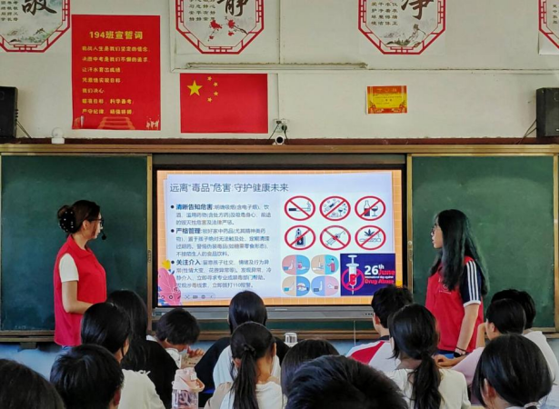 活动以“认识毒品:伪装下的致命陷阱”为切入点。实践团成员何雨涵、罗晓萱通过PPT演示,结合真实案例,讲解毒品如何通过日常食品包装伪装,诱导青少年误食的隐蔽性。“这些‘糖果’可能含有合成大麻素,一旦沾染,不仅有害身心,更遭到法律严惩。”为增强参与感,实践团设计“防毒知识快问快答”环节。“发现同学接触可疑物品该怎么办?”“遇到陌生人递饮料要怎么做?”问题抛出,数十只手臂高高举起,“报告老师”“坚决拒绝”的答案赢得了现场掌声。