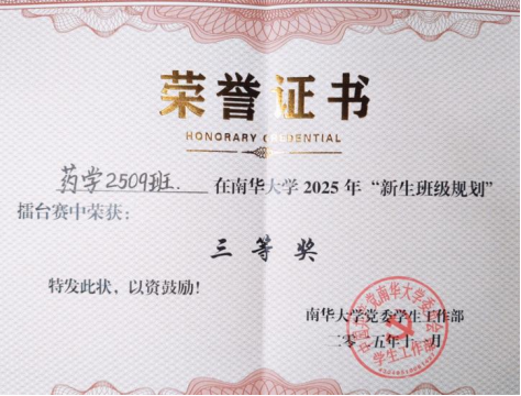 药学2509班作为新生班级代表,在竞争激烈的新生班级规划擂台赛中凭借出色的团队协作和创新表现荣获三等奖,彰显了新生班级的凝聚力与创造力。