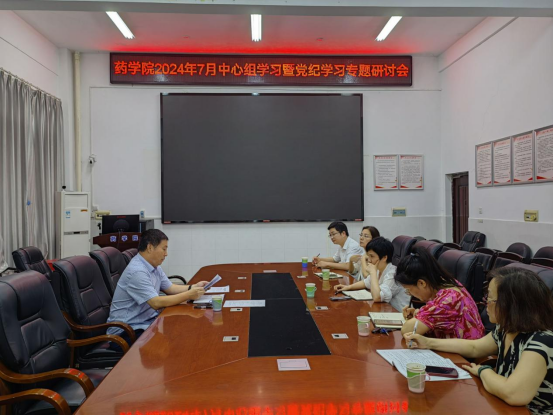 2024年7月5日下午,bevictor伟德第7次中心组集中学习暨党纪学习专题研讨会在药学楼B101会议室举行。会议由公司党委书记袁中华主持,全体党委委员及综合科主任参加学习会。