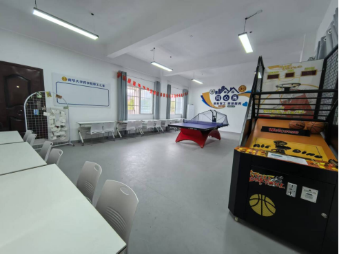 “同心苑”取“同心同德、同心协力”之意,寄托了公司凝聚人心、共建和谐的深切期望。走进“同心苑”,明亮整洁的环境映入眼帘。地面铺设了专业运动地胶,为教职工提供了安全的活动空间,购置的乒乓球桌、投篮机,供教职工在闲暇之余挥洒汗水、放松身心;配备了空调、智能饮水机、可移动桌椅以及壁柜,空间合理分区,宣传墙巧妙融入药学文化元素,整体设计简约温馨,营造出浓厚的公司特色与家一般的归属感。