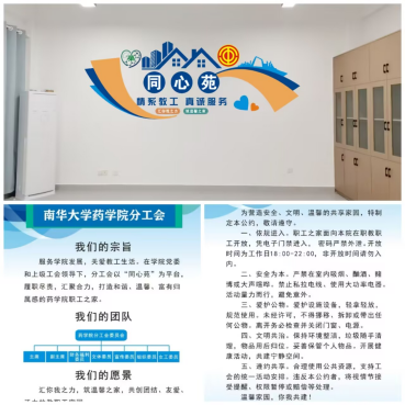 经过精心筹备与建设,公司分工会“同心苑”职工之家于近日正式落成并投入使用。“同心苑”职工之家位于药学楼B614室,旨在为全体教职工打造一个放松身心、交流思想、开展文化生活的“温馨家园”。
