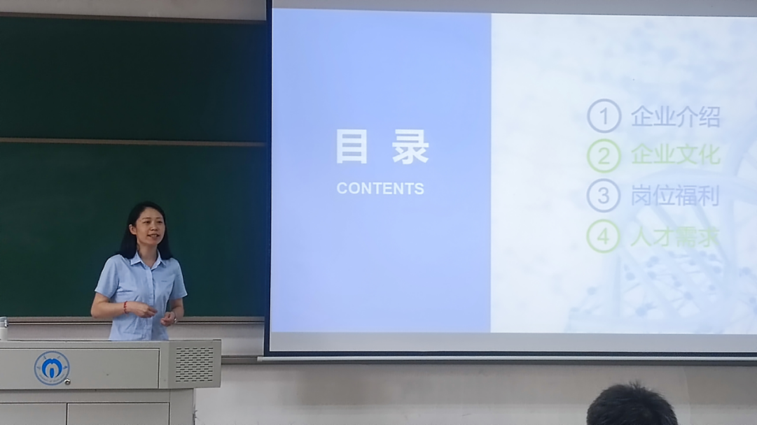下午,长沙晶易医药科技股份有限公司于南华楼511展开宣讲会开始前,先由公司人力资源专员介绍了公司的成立背景,规模,研究方向,以及取得的诸多成就等,让同学们对公司有了更加深入的了解。随后,她又介绍了目前实习的一些职位和实习的培训亮点、课程体系等,让同学们对岗位需求有了了解。最后,她向同学们介绍了工作的环境和薪酬待遇。同学们积极倾听,在答疑环节与招聘负责人积极互动,得到了耐心的解答。