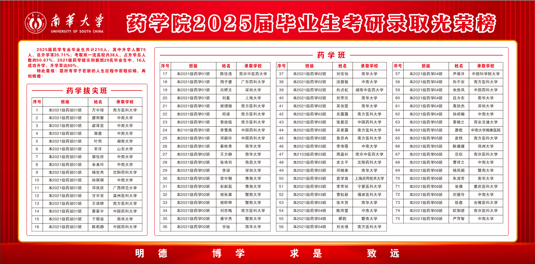 2025届药学专业毕业生共计210人,其中升学人数75人,总升学率35.71%;考取双一流高校共38人,占升学总人数的50.67%。2021级药学拔尖创新班20名毕业生中,16人成功升学,升学率达80%。