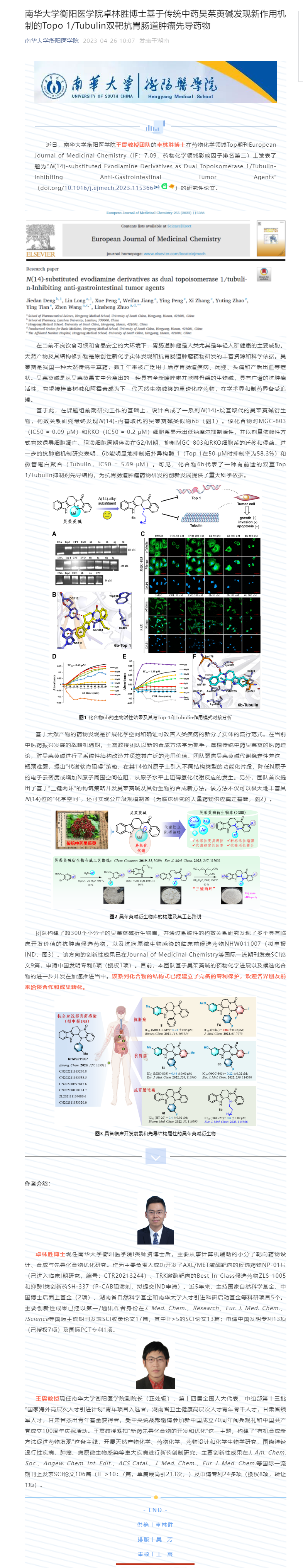 近日,伟德官方网站衡阳医公司、肿瘤微环境响应药物研究湖南省重点实验室王震教授团队的卓林胜博士在药物化学领域Top期刊European Journal of Medicinal Chemistry(IF:7.09,药物化学领域影响因子排名第二)上发表了题为“N(14)-substituted Evodiamine Derivatives as Dual Topoisomerase 1/Tubulin-Inhibiting Anti-Gastrointestinal Tumor Agents”(doi.org/10.1016/j.ejmech.2023.115366)的研究性论文。